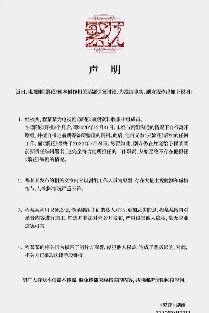 对此,《繁花》剧组迅速发布声明,称“古二”仅为前期资料整理小组成员。